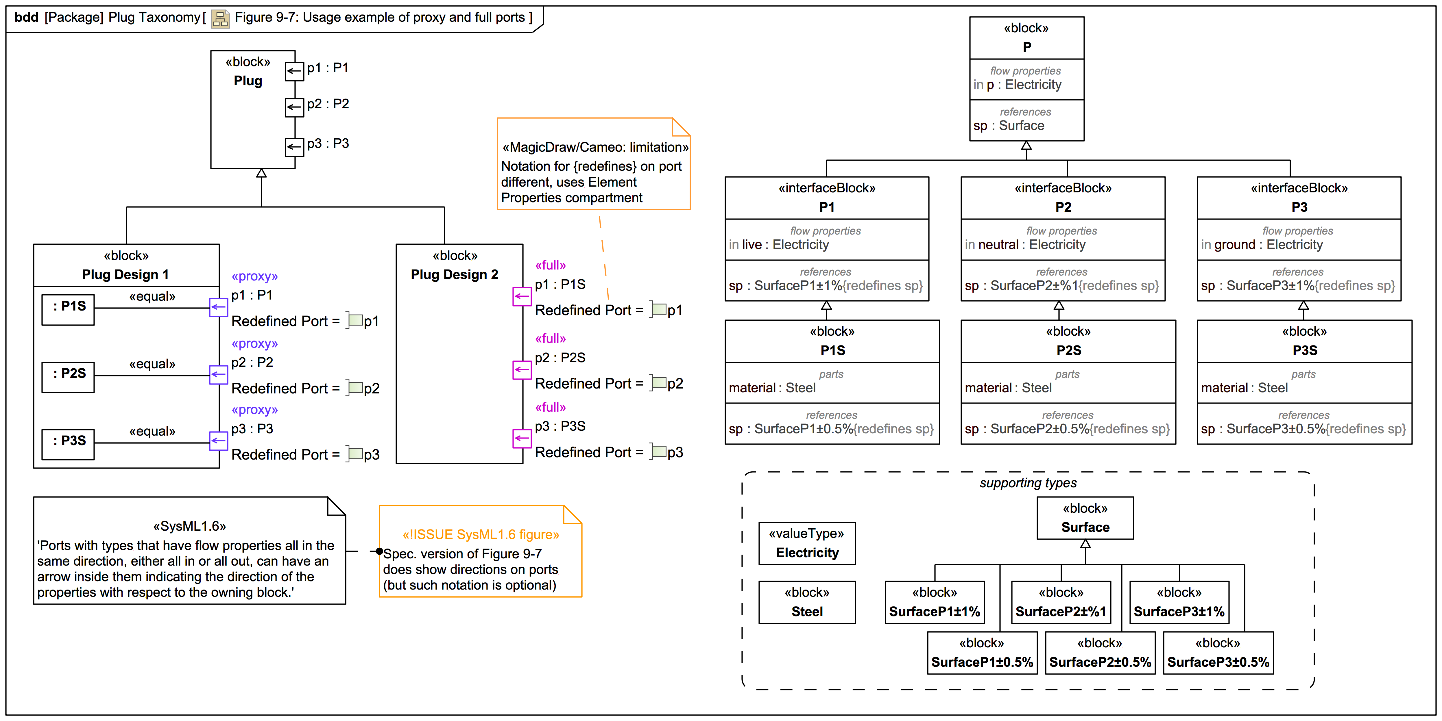 SysML-1.6: 'For example, if the port types on the general block in Figure 9-7 had behaviors defined, then the proxy specialization would be invalid. If the general ports had binding connectors to internal parts, then the full specialization would be invalid. If the general ports had both behaviors and internal binding connectors, then both specializations would be invalid.'