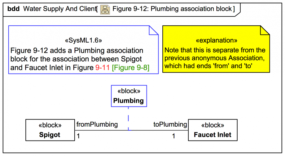 SysML-1-6: 'Figure 9-12 adds a Plumbing association block for the association between Spigot and Faucet Inlet in Figure 9-11.'