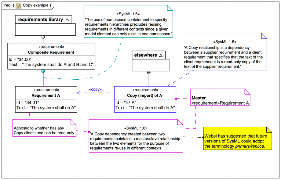 The Copy relationship enables reuse of a Requirement from a read-only library and reuse of a child Requirement that is owned by a parent composite requirement (a.k.a. compound requirement):