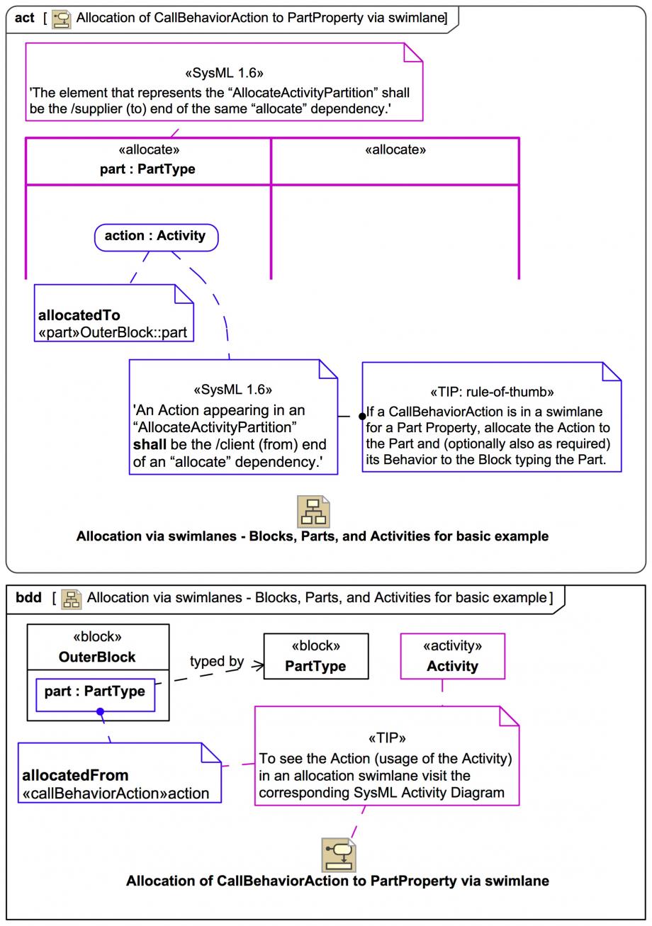 AllocateActivityPartition "swimlanes" in Activity Diagrams are an easy way to manage "classic" functional (a.k.a. behavioral) allocation of a CallBehaviorAction to a part Property: