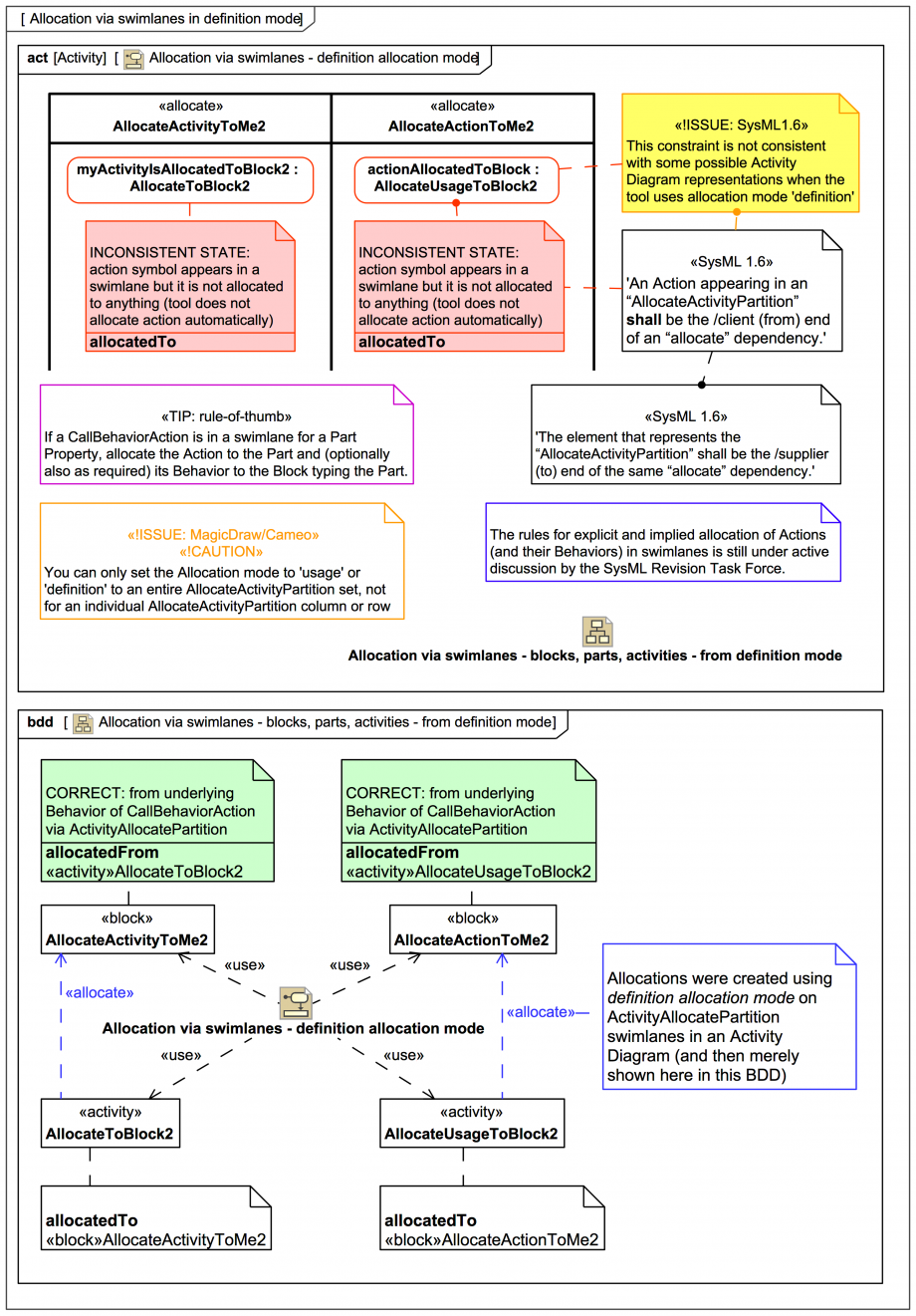 We now look at what happens if one tries to combine (misuse) CallBehaviorActions in swimlanes in Activity Diagrams with definition allocation mode, including some "pathological" cases that have been provoked: