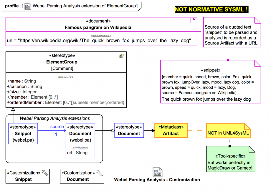 The slide shows how the ElementGroup can be extended using custom stereotypes, based on a simplified form of the Webel Parsing Analysis recipe for SysML.