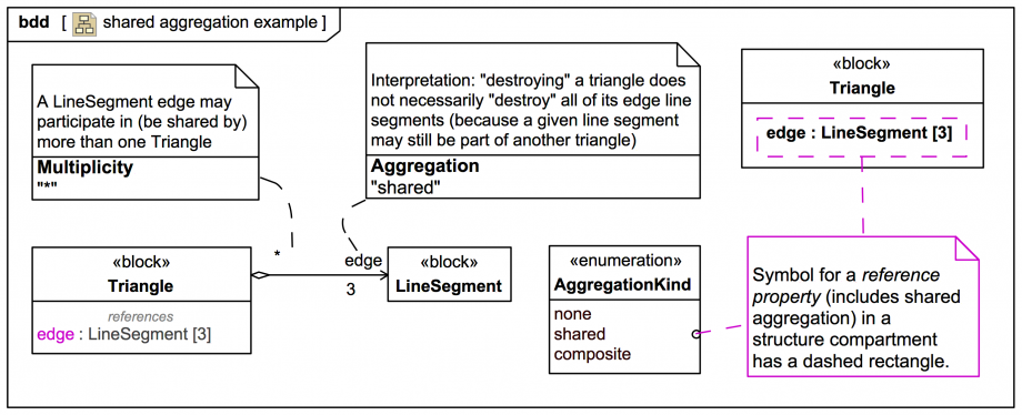 Ah, the joys of shared aggregation. If only anyone knew what it actually means. One thing I know; just because it not easy to define the semantics sufficient for execution engines does not mean it is not immensely useful to pragmatic SysML modellers. It certainly means something to a lot of users.Here we look at just one example of how one might use shared aggregation. Consider one triangle - which be definition has three edges - that shares one of those edges with another triangle. Good ol' Wikipedia tells us that: