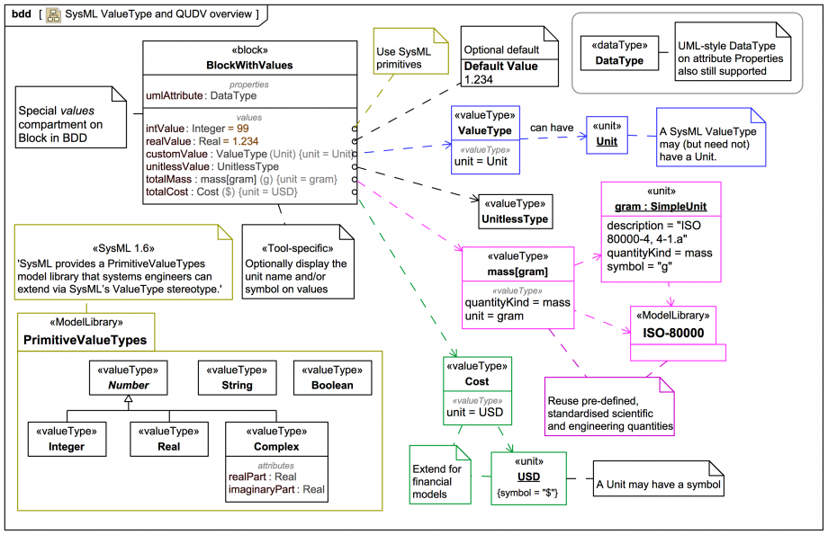 Both ValueType and Unit can carry an optional QuantityKind; we'll look at that later in a dedicated advanced tutorial trail section. But first, let's see next how value properties work, and how to use values in a system.