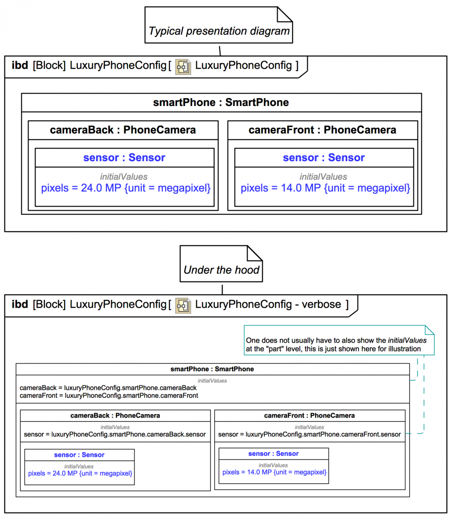 :The upper IBD shows how one might present the result to stakeholders; the notation can be easily read by non-SysMLers (except for the unfortunate naming of the initialValues compartment).