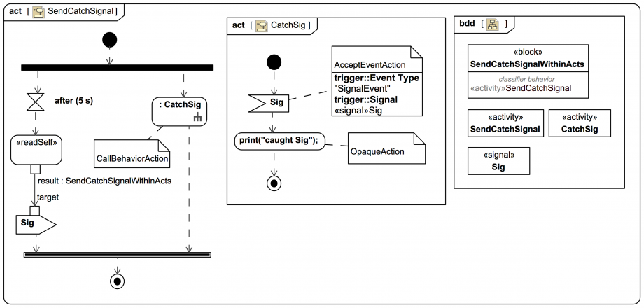 This is actually a SysML Activity Diagram with dashed-line ControlFlow symbols, and a Block is used instead of a Class. It also shows a SysML style «activity» on a BDD.