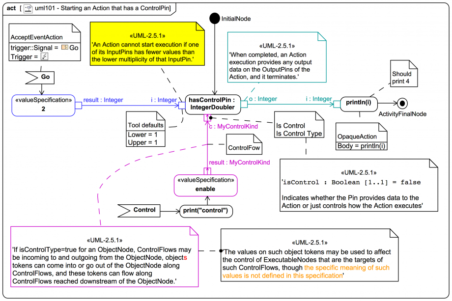 Please note that SysMLv1 extends UML2 with more flexible control capabilities. Please visit also the following slide (from the SysMLv1 topics section), which links to many other examples on this site: