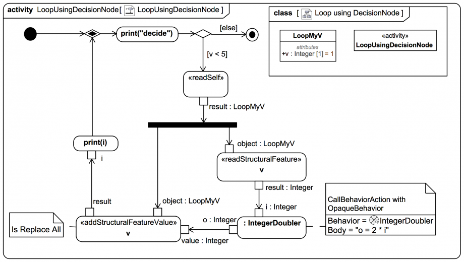 Apart from demonstrating DecisionNode and MergeNode used together to create a "manual" loop, this slide shows some additional aspects of Activity Diagrams and has some additional diagnostic outputs for the simulation (play also the mini video below):