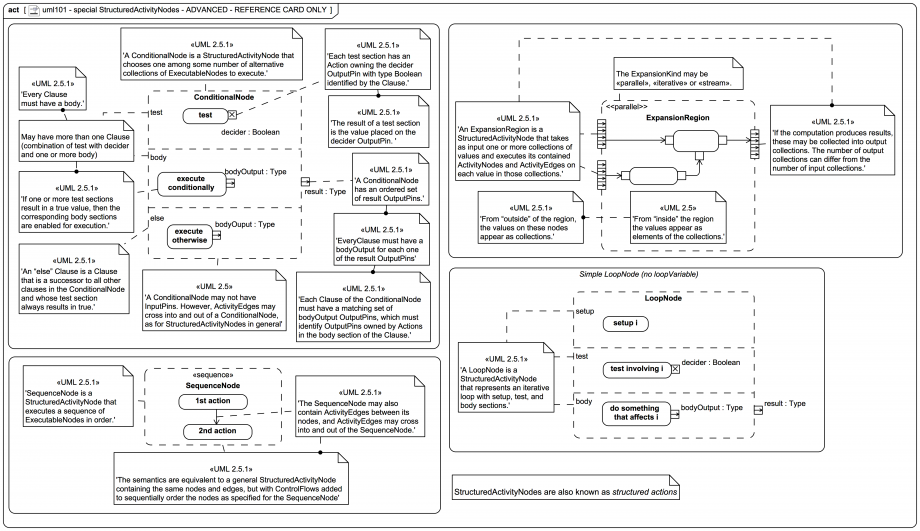 Gallery Tutorial TRAIL: Webel's ultimate guide to Systems Modeling Language (v1) with MagicDraw/Cameo Section 01:04: UML Behavior: Activities quick start Tags and keywords Topic level ADVANCED UML keywords Activity Activity Diagram structured action StructuredActivityNode ExpansionNode LoopNode ConditionalNode SequenceNode Keywords simulation Magic Model Analyst [Cameo Simulation Toolkit] Slide kind UML Activity Diagram This content has been marked as discussing an ADVANCED topic! Click on the image to view it full size NOTATION REFERENCE ONLY: This diagram is not meant to be executable! For a simulation mini video of an InterruptibleActivityRegion visit: SysMLv1: Cameo Simulation Toolkit: Activity Simulation: Activity Diagram simulation: An InterruptibleActivityRegion with Interrupt [with mini video] Up next 08:01: The building Blocks of SysMLv1 Notes [TIP]{OPTION} Not every task in Activity Diagrams is well-suited to graphical modelling and LoopNode and ConditionalNode are notoriously fiddly to setup; consider using Action Language Helper (ALH) or Action Language for Foundational UML (Alf) Snippets (quotes/extracts) Related slides (includes other tutorials) UML2 Activity Diagram - essential metaclasses - ADVANCED REFERENCE ONLY LoopNode with loopVariable - ADVANCED REFERENCE UML2 Actions - metaclasses - ADVANCED REFERENCE ONLY Related slides (backlinks, includes other tutorials) SysMLv1: Cameo Simulation Toolkit: Activity Simulation: Activity Diagram simulation: An InterruptibleActivityRegion with Interrupt [with mini video] Visit also Alf zone Visit also (backlinks) Flags Book traversal links for StructuredActitivityNodes (structured actions) - ADVANCED REFERENCE ONLY Previous Up Next