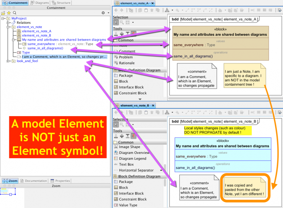 Rule #1: A UML or SysML Element in a tool is NOT just an Element symbol in a diagram! A Note is not an Element (compare with a Comment).