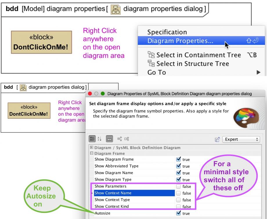 MagicDraw/Cameo: HOWTO turn off verbose context information in SysML-style diagram frames