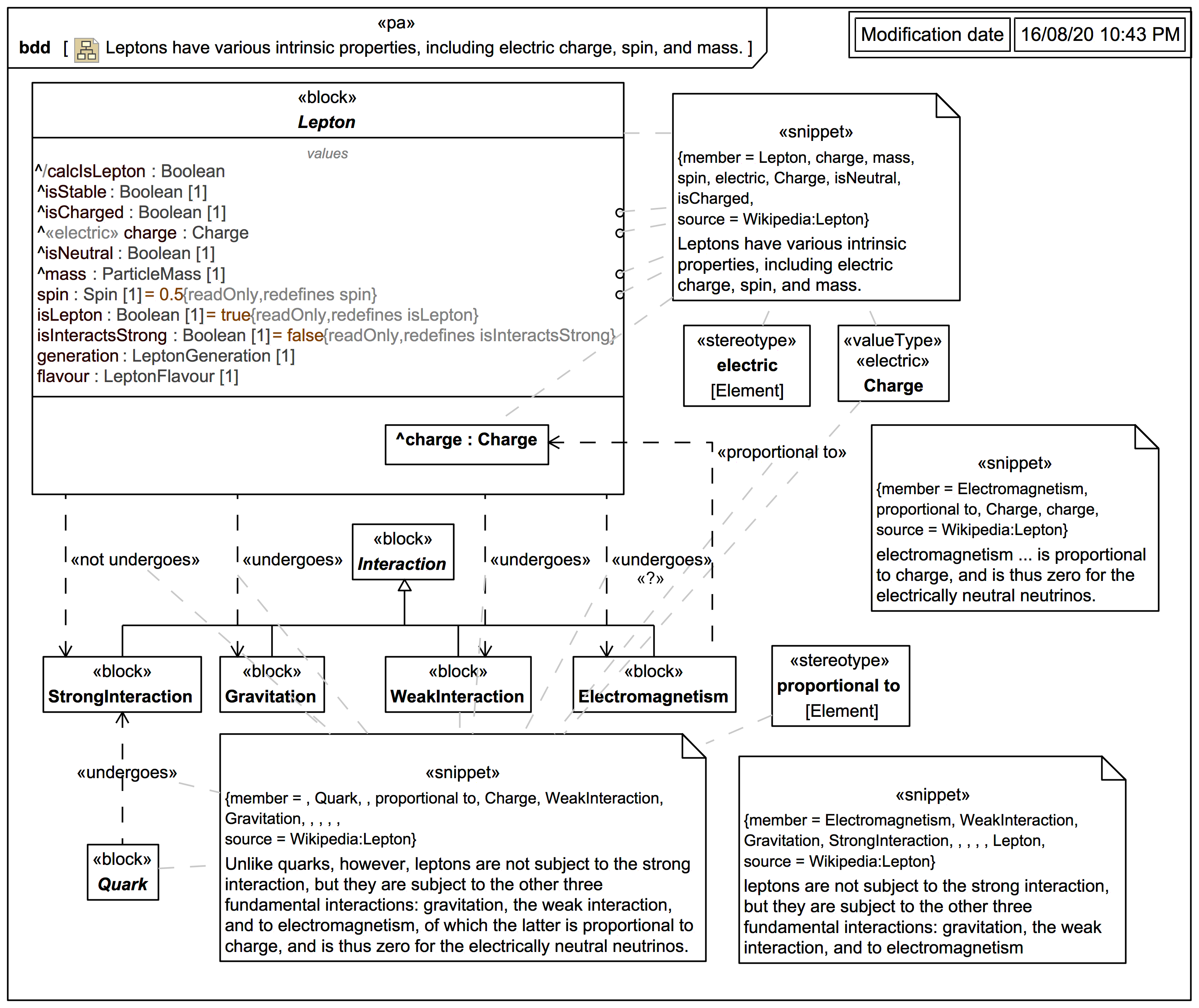 The corresponding stereotyped «undergoes» Dependency should perhaps be bumped down to ChargedLepton