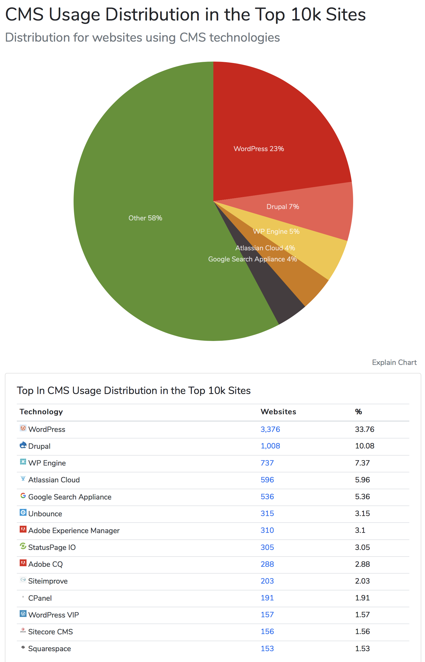 There is a live pie/line graph system on Built With: Web Technology Trends under Content Management System, which enables you to generate stats for various CMS systems including Drupal for the world's top 10K sites, top 100K sites, top 1M sites, and the all CMS sites. As of 08 Jan 2020 they show that Drupal runs about 10.08% of the world's top 10K sites (and about 2.67% of the top 1 Million sites):