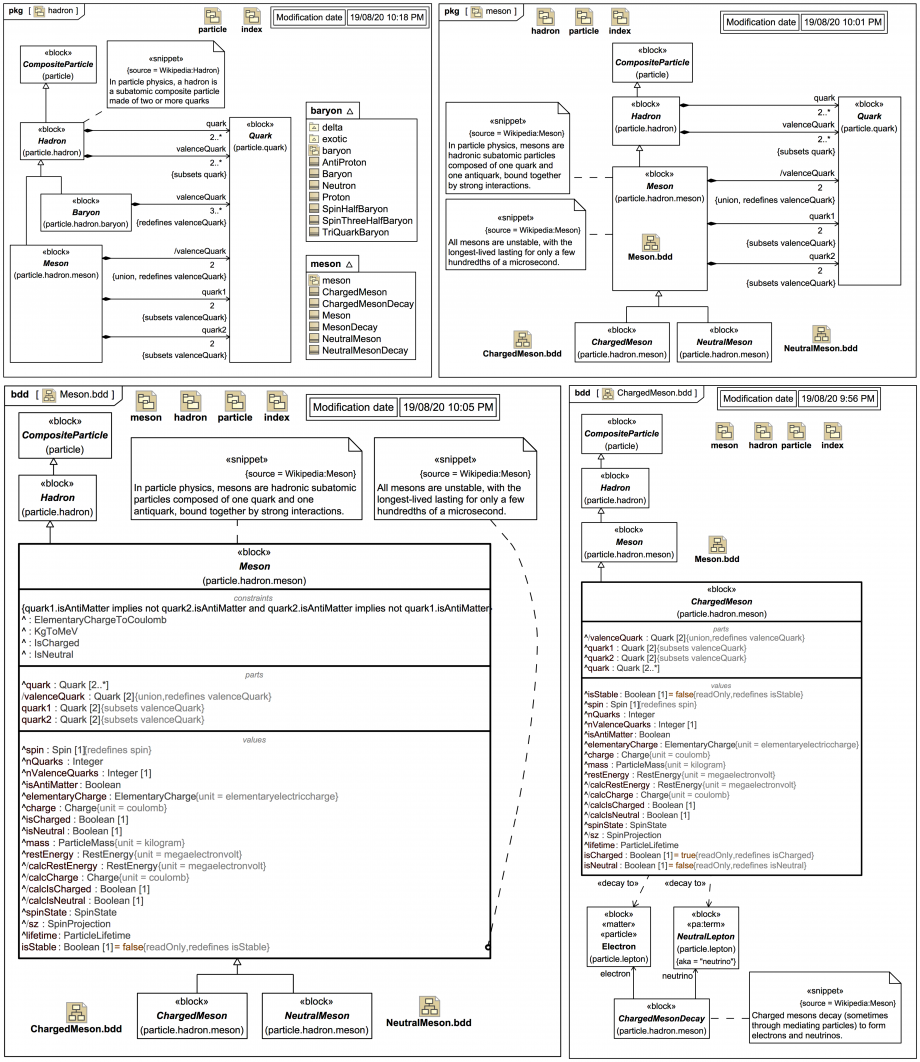 The model elements elicited from the snippets about mesons can then be collated along with concise versions of the snippets in Package Diagrams and focus BDDs: