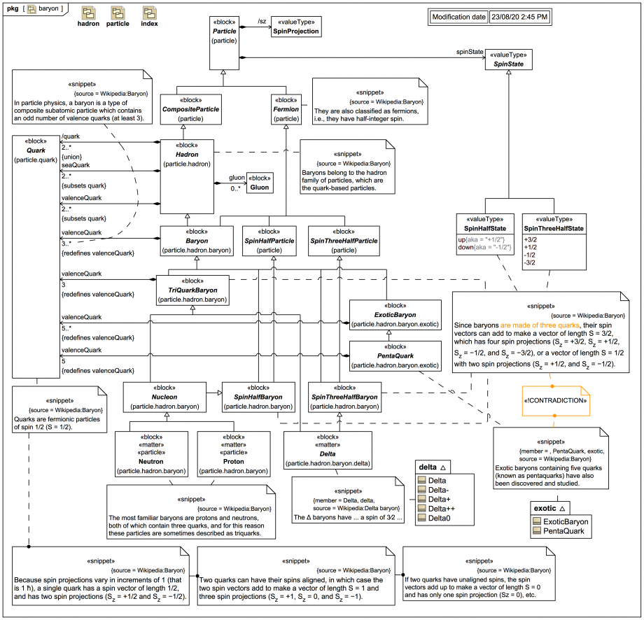 Gallery Tutorial TRAIL: Webel SysML Parsing Analysis example: A particle physics taxonomy from Wikipedia Section Tags and keywords Topic level INTERMEDIATE UML keywords Association SysML keywords ValueType Block Keywords Webel Parsing Analysis baryon nucleon particle physics Systems Modeling Language proton neutron gluon hadron fermion delta baryon pentaquark WPA:«snippet» Slide kind SysML Package Diagram This diagram just cleans up some inconsistencies encountered during analysis of snippets for a previous slide, and includes Nucleon: Click on the image to view it full size Up next The neutron is classified as a hadron, because it is a composite particle made of quarks. Notes [ASSERTION, DISPLAY, POLICY, SETTINGS, STYLE, TOOL]{STRICT} Webel Parsing Analysis: If you wish to show a «snippet» comment symbol (with its body text) in a presentation diagram (that is NOT a «pa» diagram) remove the '/member' tagged value from display so the only visible tagged value is 'source'. Snippets (quotes/extracts) Related slides (includes other tutorials) Some more baryons (and even more baryons) Neutrons and protons are spin-1/2 fermions and baryons Related slides (backlinks, includes other tutorials) Visit also Visit also (backlinks) Flags Book traversal links for Improved baryon Package Diagram including Nucleon, Proton, Neutron Previous Up Next