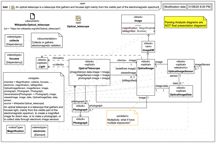 The snippet implies that the 'magnified image for direct view' is not necessarily the same as the image captured by a photograph or by an image sensor. If you know a little about telescopes you might already know that in fact when an eyepiece is used a real image gets magnified by the eyepiece to create a virtual image that the eye can in turn view (as a further real image on the retina), as we'll explore in more detail later in the trail. For now it suffices to introduce a distinct reference property viewedImage:OpticalImage