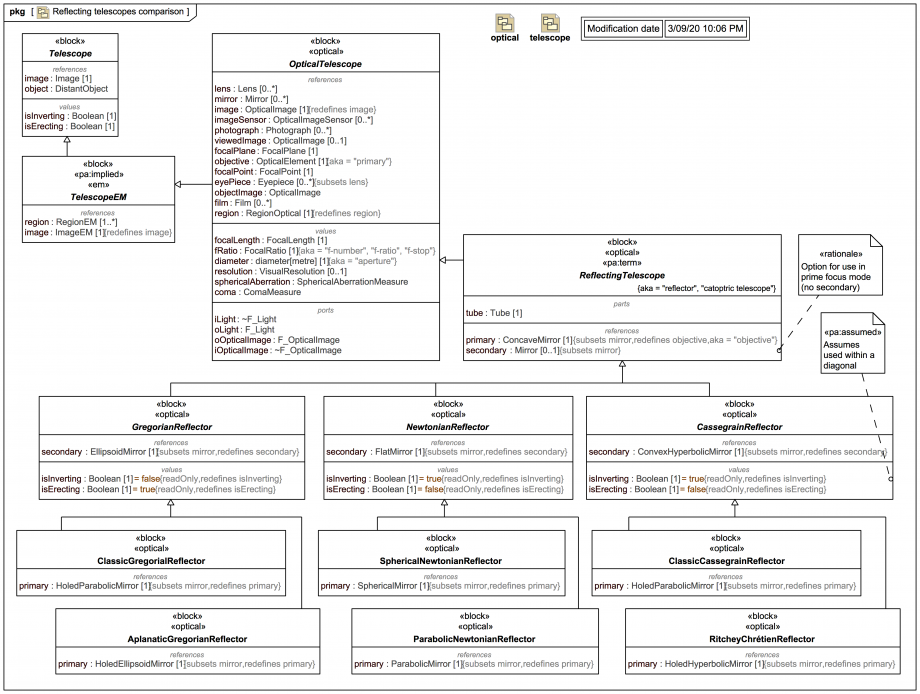 If you've been following this trail from the start, you'll understand how the "redefinition ladders" and property subsetting have been used to carefully capture the variations between the telescopes types. Always remember when working with SysML: