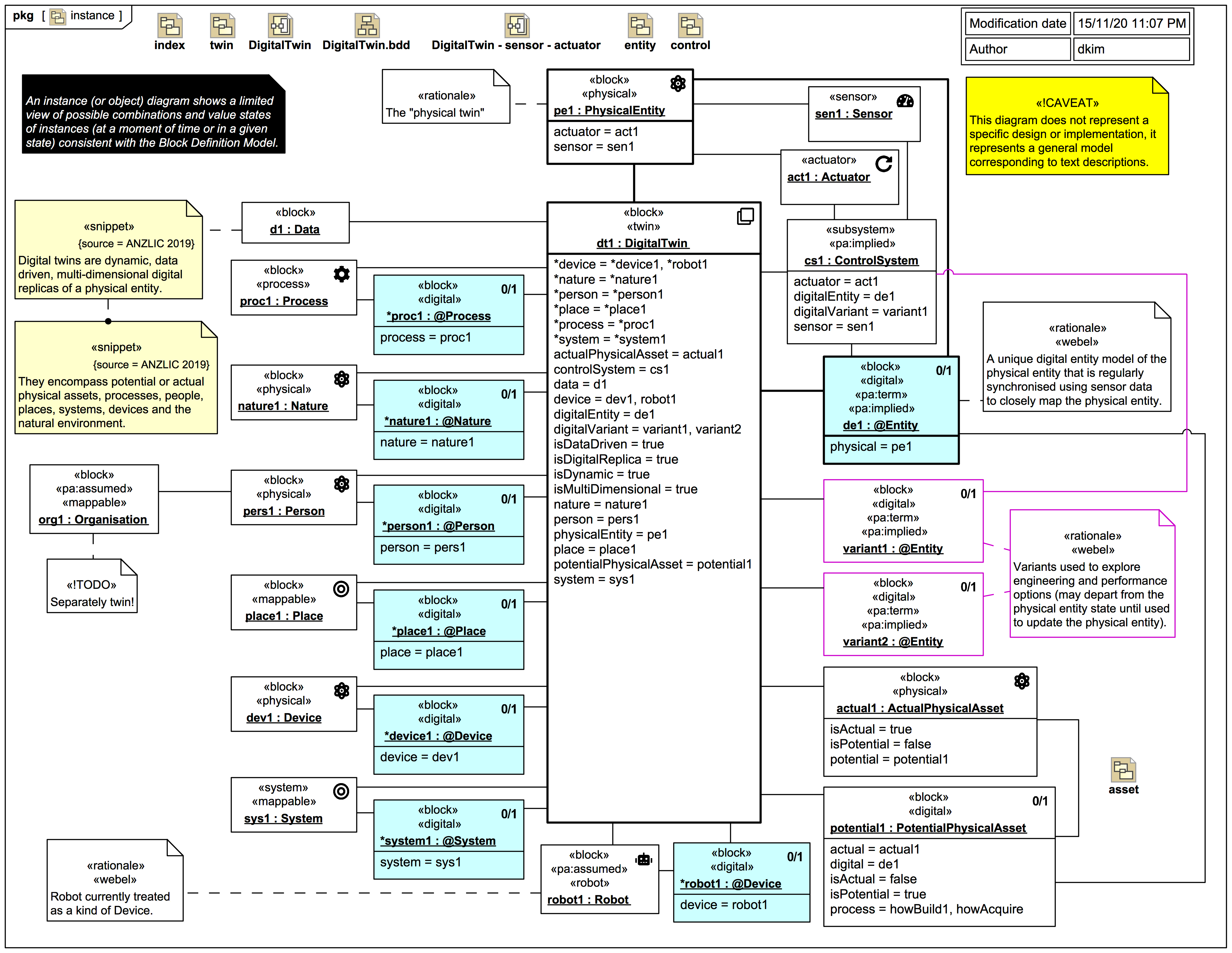 Webel Twin Pattern: A DigitalTwin may use one or more variantEntity:@Entity[0..*] to explore the impact of changes (optimisation studies, trade off studies) and then use them to drive the PhysicalEntity into a desired state (via its ControlSystem).