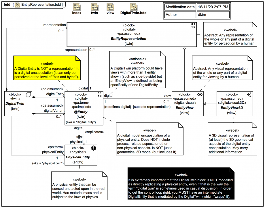 Gallery Tutorial TRAIL: The Webel SysMLv1 Pattern for Digital Twinning Section Tags and keywords Topic level INTERMEDIATE SysML keywords SysML Block Definition Diagram Keywords WTP:DigitalEntity WTP:PhysicalEntity WTP:@Entity Webel Twin Pattern Slide kind SysML Block Definition Diagram (BDD) Magritte again: Wikipedia: 'The famous pipe. How people reproached me for it! And yet, could you stuff my pipe? No, it's just a representation, is it not? So if I had written on my picture "This is a pipe", I'd have been lying!' Click on the image to view it full size CAVEAT: The current Font Awesome icon used for 3D views is in fact actually a Unity branding icon [as a placeholder] that WILL change. Up next 07: BDD of twin control loop Blocks Notes [CONVENTION]{SUBJECT-TO-CHANGE} Webel: Convention: [MIGHT CHANGE]: An '@' prefix in a DigitalTwin model indicates a «digital» Block that maps a non-digital «mappable» Block. [POLICY]{STRICT} Webel Twin Pattern: A DigitalTwin must model processes and the entities they act on separately. [POLICY]{STRICT} Webel Twin Pattern: A «digital» DigitalEntity (a.k.a. @Entity) encapsulates strictly geometrical, spatial, and material aspects of a «physical» PhysicalEntity only. BY DEFINITION of this pattern it DOES NOT encapsulate processes! [POLICY]{STRICT} Webel Twin Pattern: It is a DigitalEntity (a.k.a. @Entity) - not the DigitalTwin that owns it - that directly «replicates» geometrical, spatial, and material aspects (only) of a single PhysicalEntity. [POLICY]{STRICT} Webel Twin Pattern: A PotentialPhysicalAsset is «digital», not «physical». It is used to acquire (an existing) or create (build, manifest, make) an «physical» ActualPhysicalAsset, which is a special case of «physical» PhysicalEntity. [POLICY]{STRICT} Webel Twin Pattern: A DigitalTwin manages a control loop including a PhysicalEntity and a DigitalEntity (a.k.a. @Entity) that «replicates» it. It typically includes at least one Sensor and at least one Actuator. [WARNING]{INFORMATIVE} WARNING: In natural language casual conversation one often hears people speaking of a digital twin "replicating" or "twinning" a physical entity. If you do it that way literally, you will NOT have anything to manage the control system loop! [POLICY]{STRICT} Webel Twin Pattern: A «digital» DigitalEntity (a.k.a. @Entity) is NOT a representation! It is a digital encapsulation (it can only be perceived at the level of "bits and bytes"). It HAS many representations (such as views)! [POLICY]{STRICT} Webel Twin Pattern: The primary aim of the digitalEntity:@Entity of a DigitalTwin is to replicate its physical:PhysicalEntity as closely as possible (not to explore variants). [POLICY]{STRICT} Webel Twin Pattern: A DigitalTwin may use one or more variantEntity:@Entity[0..*] to explore the impact of changes (optimisation studies, trade off studies) and then use them to drive the PhysicalEntity into a desired state (via its ControlSystem). [WARNING] CAVEAT: The current Font Awesome icon used for 3D views is in fact actually a Unity branding icon [as a placeholder] that WILL change. Snippets (quotes/extracts) The famous pipe. How people reproached me for it! And yet, could you stuff my pipe? No, it's just a representation, is it not? So if I had written on my picture "This is a pipe", I'd have been lying! Related slides (includes other tutorials) Related slides (backlinks, includes other tutorials) Visit also Visit also (backlinks) Flags Book traversal links for 06: Focus BDD for EntityRepresentation Previous Up Next