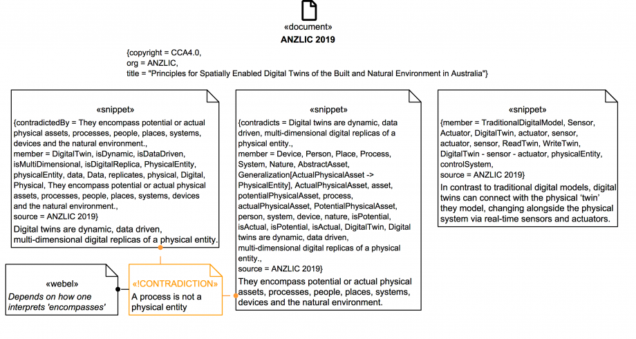 To get us started we are going to map some text from ANZLIC 2019 as a target domain source document to SysML traceably via «snippet» elements (custom Webel extensions of the SysML ElementGroup):