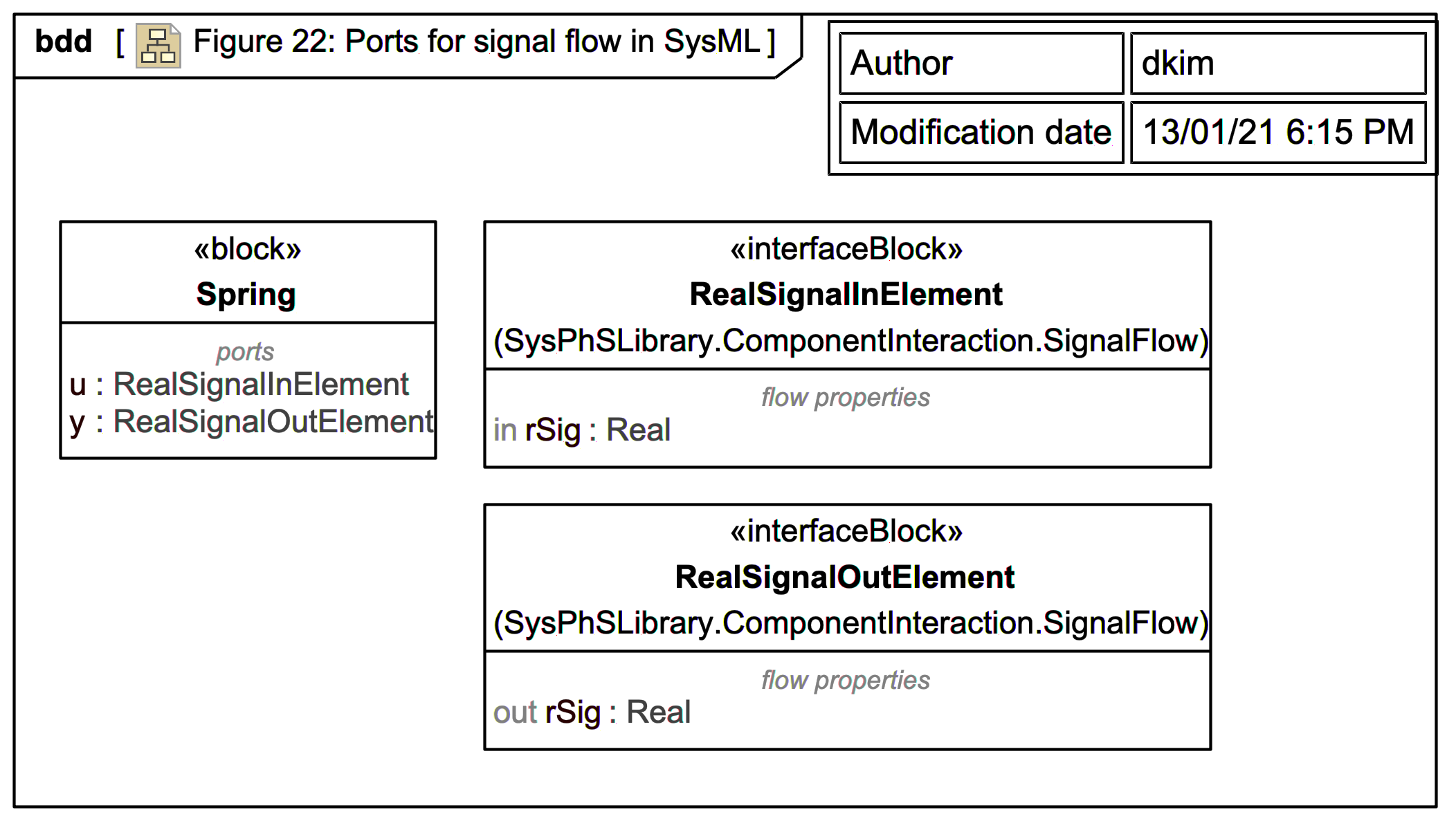 SysPhS-1.1: 'Figure 22 shows an example signal flow application. The block Spring has two ports u and y, of type RealInSignalElement and RealOutSignalElement from the signal flow library ..., respectively. RealInSignalElement has an in flow property rsig, while RealOutSignalElement has the same property with an out direction.'