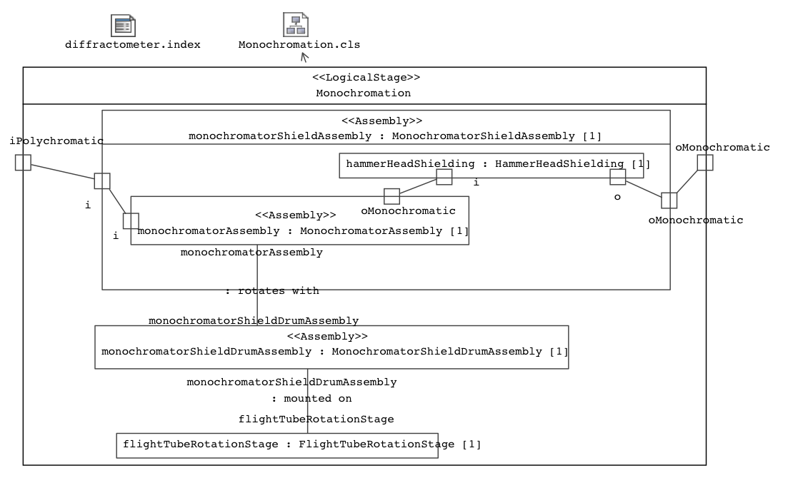 Shows beam-centric organisation of the system dictated by neutron flow ports (as opposed to assembly-centric organisation). The monochromator shield assembly is screwed to a concrete floor, the monochromator assembly (including goniometer) rotates with a monochromator shield drum assembly (which is partly inside and partly outside of the fixed monochromator shield assembly), and the beam passes through both “fixed” and “moveable” parts. The use of flowports helps to organise the model according to the logic of the beam. Note the difficulty in reflecting the horizontal beam path concisely.