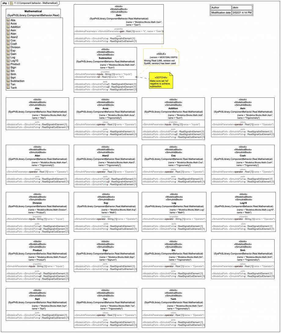 The following diagram shows a Block Definition Diagram (BDD) style representation of MagicDraw/Cameo SysPhSLibrary components vs the SysPhS-1.1 spec table 11.3.2.5 Mathematical components: