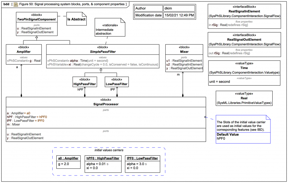 SysPhS-1.1: 'The amplifier, filters (high-pass and low-pass), signal source, and signal sink have properties g, alpha and xi, amp, and scope, respectively. The amp, alpha and g properties have the PhSConstant stereotype applied, specifying that their values are constant during each simulation run. The xi and scope properties have the PhSVariable stereotype applied, specifying that their values might vary during simulation.'