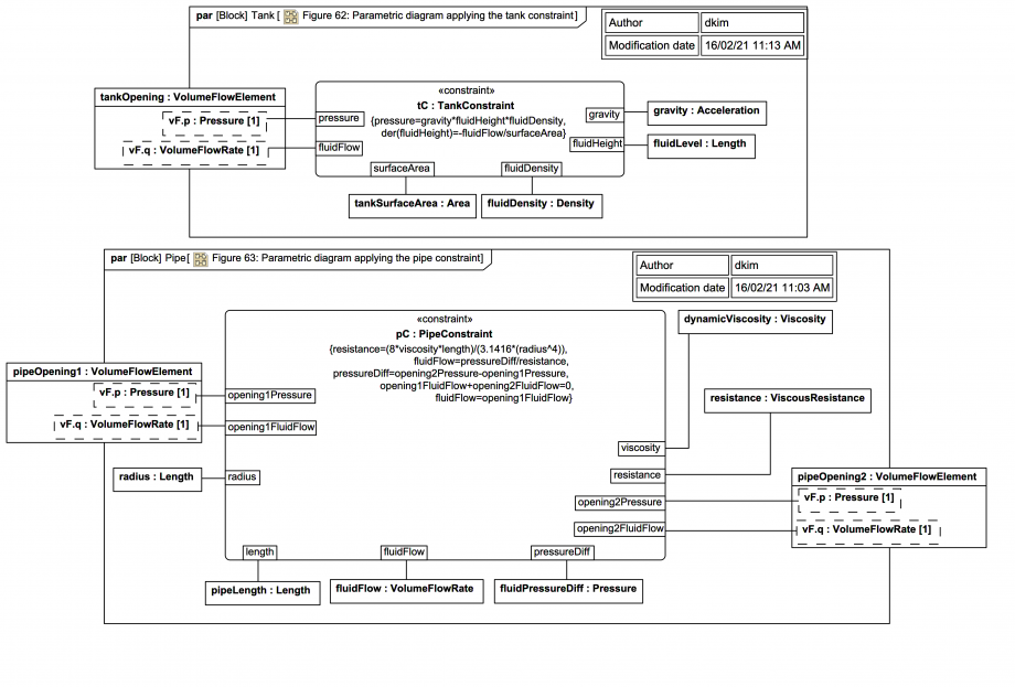 SysPhS-1.1: 'Equations in constraint blocks are applied to components using binding connectors in component parametric diagrams. Component parametric diagrams show properties typed by constraint blocks (constraint properties), as well as component and port simulation variables and constants. Binding connectors link constraint parameters to simulation variables and constants, indicating their values must be the same. Figure 62 and Figure 63 show the parametric diagrams of the tank and the pipe, respectively.'