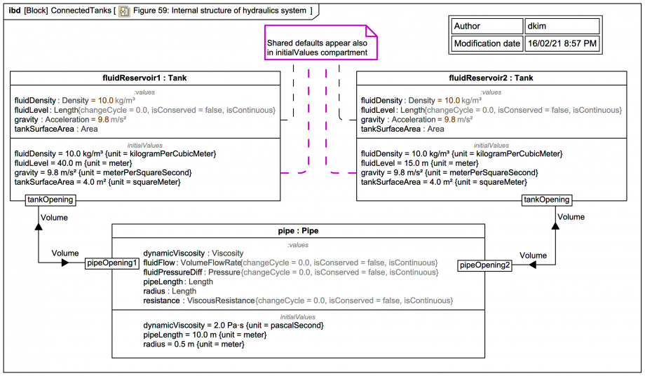 The slide shows a trail version of Internal Block Diagram (IBD) Figure 59: Internal structure of hydraulics system with the SysML :values compartment showing, exploiting this capability of SysML-1.6: