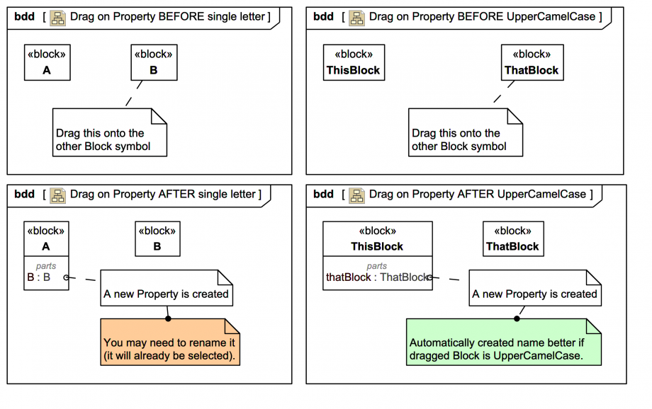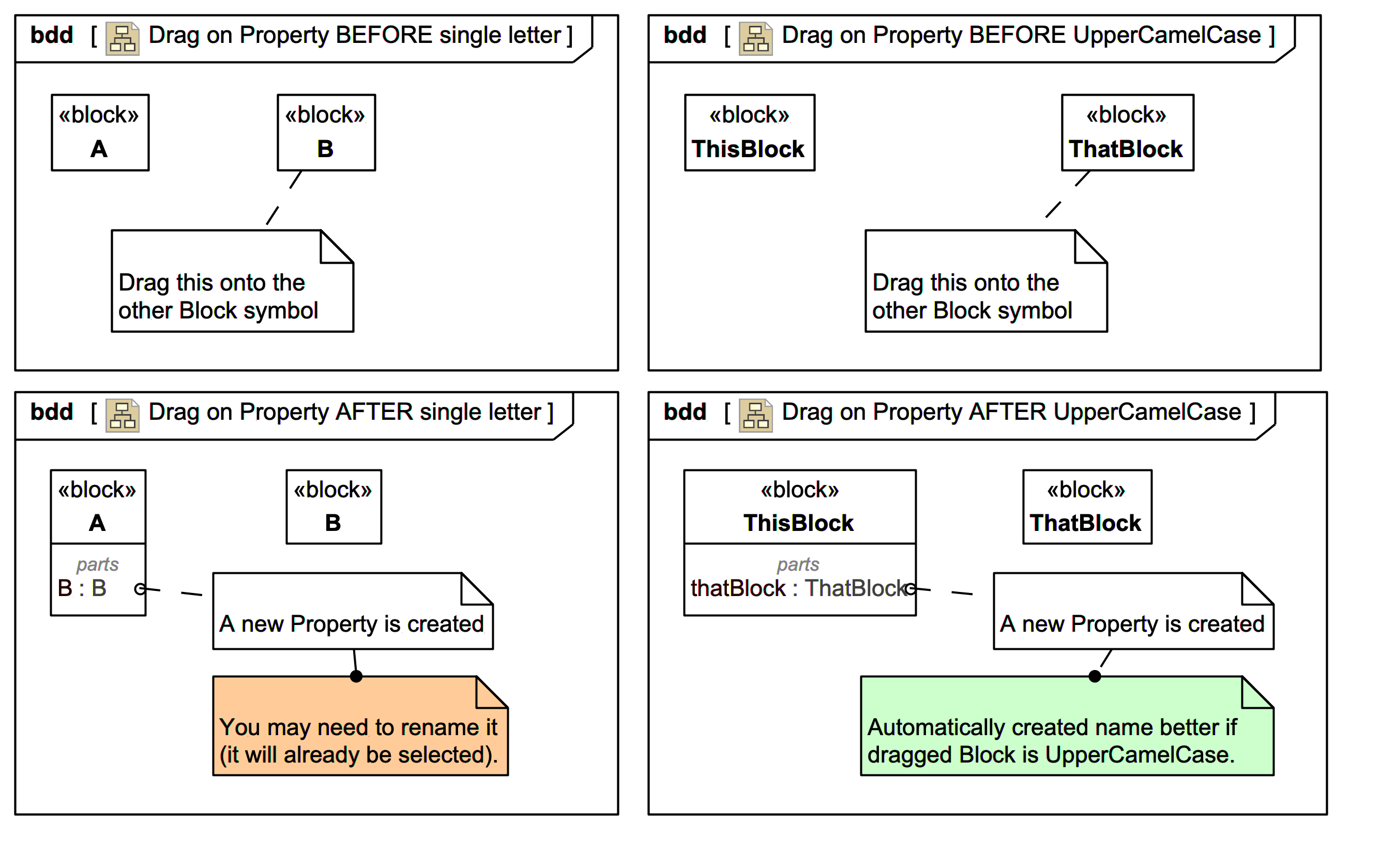 - A dragged-on Class or Block will usually create a Property with AggregationKind 'composite' (so it will be considered a 'part').