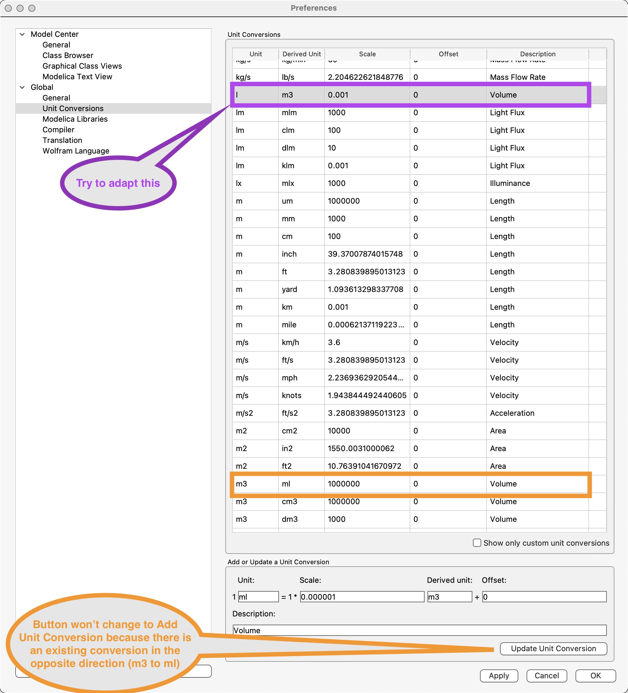 In the example, following the Wolfram SystemModeler instructions here, an attempt was made to adapt the 'l to m3' conversion to a new 'ml to m3'. The button Add Unit Conversion won't be offered, it will stay at Update Unit Conversion, because there is a existing conversion in the opposite direction 'm3 to ml'.