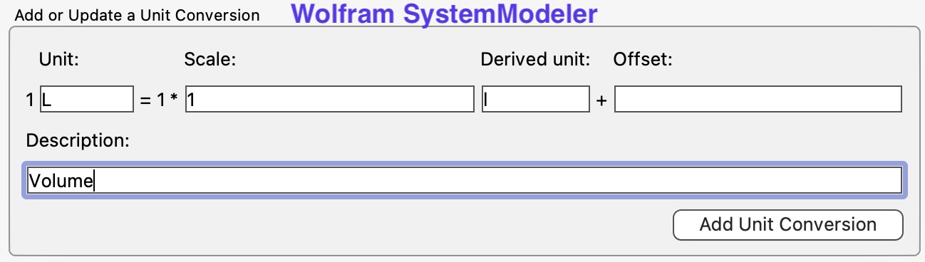 You can nevertheless use "L", "mL" etc. if you prefer as long as you introduce a custom converters. The way to achieve this may differ between Modelica tools, for Wolfram SystemModeler visit: Model Center—Variable Views.