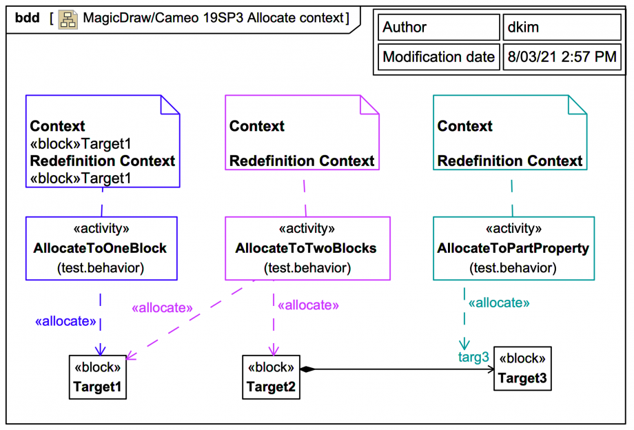 Note that if you have two Allocates from one Activity to 2 blocks the Activity will NOT have a Behavior::/context defined