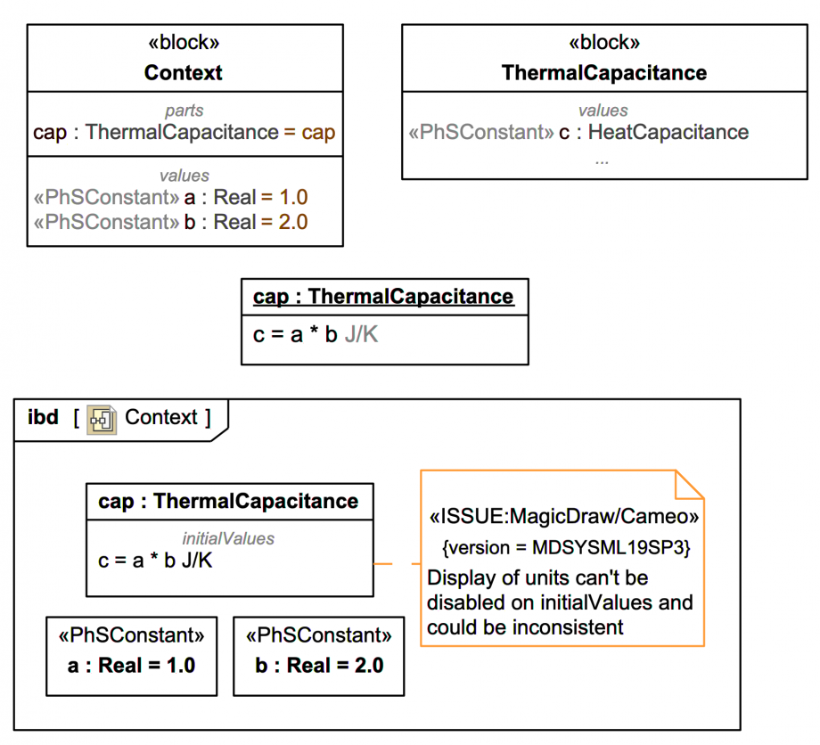 The issue arises probably because of the legacy of SysMLv1.x extending UML2.5.x. Because SysMLv1.x (unlike Mathematica) does not offer a fully Units-aware Quantity algebra, it does not take into consideration that each "variable" (value property) may carry its own units. Tacking on the Unit display in this case in fact leads to dimensional errors!