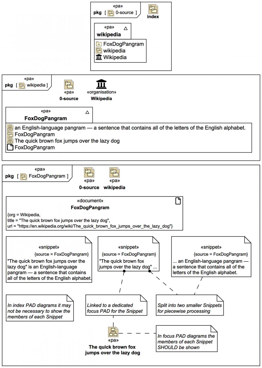 A SysML Package Diagram as an index showing simple packaging of model elements that were elicited from Snippets with text extracts from domain source documents: