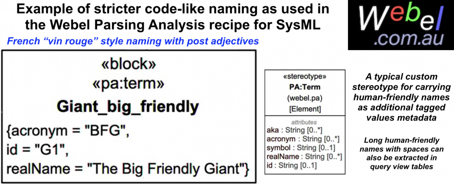 In the Webel Parsing Analysis recipe for SysML alternative names, human-friendly names, organisation-specific names, and identifiers are tracked using tagged values for a custom stereotype «pa:term» (adapt or extend as required).