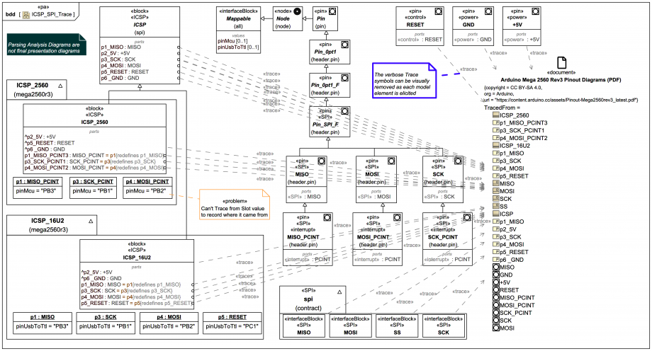 In this trail example the domain source «document» with diagrams was Arduino Mega 2560 Rev3 Pinout Diagrams (PDF), which shows pin allocations for In-Circuit Serial Programming (ICSP) headers for the Serial Peripheral Interface (SPI) for ATmega2560 and ATmega16u2 chips on an Arduino Mega2560Rev3 micro controller board. The elements that were elicited from the diagram «document» can be nicely listed in MagicDraw/Cameo using a compartment for Trace::getTracedFrom(in ref).