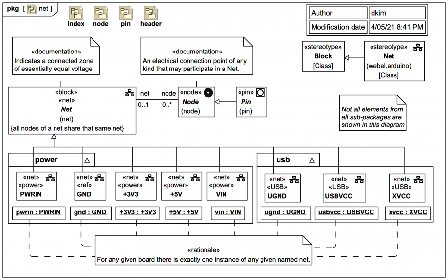 Some more specific types of nets are also shown. There is exactly one instance of each named net on a given board. It turns out that where Nodes are used to type Ports of component usages, assigning those Net