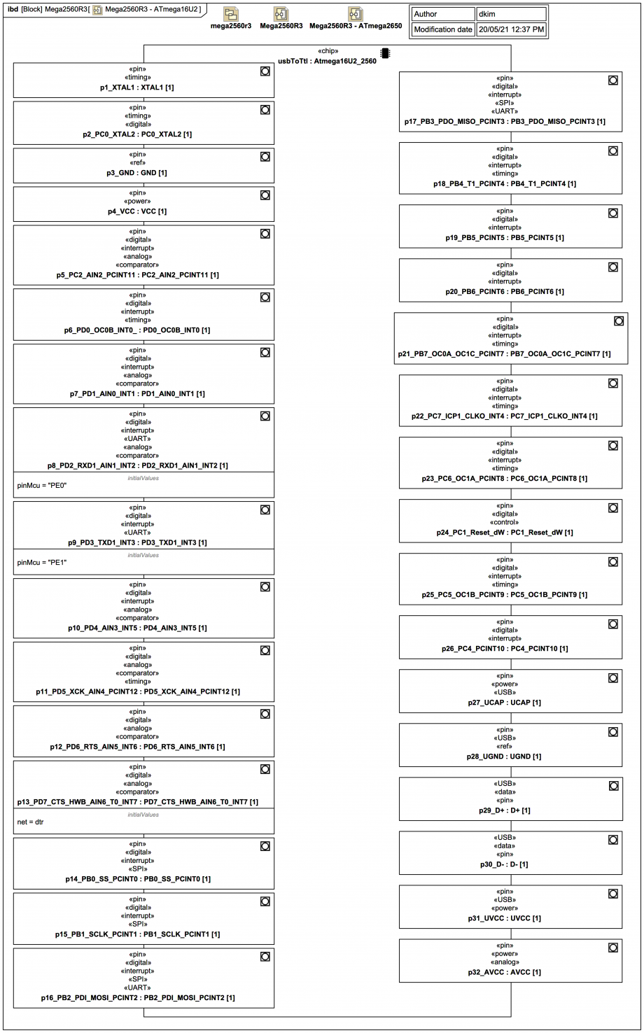 The Internal Block Diagram (IBD) shows the «chip» usbToTtl:ATmega16U2