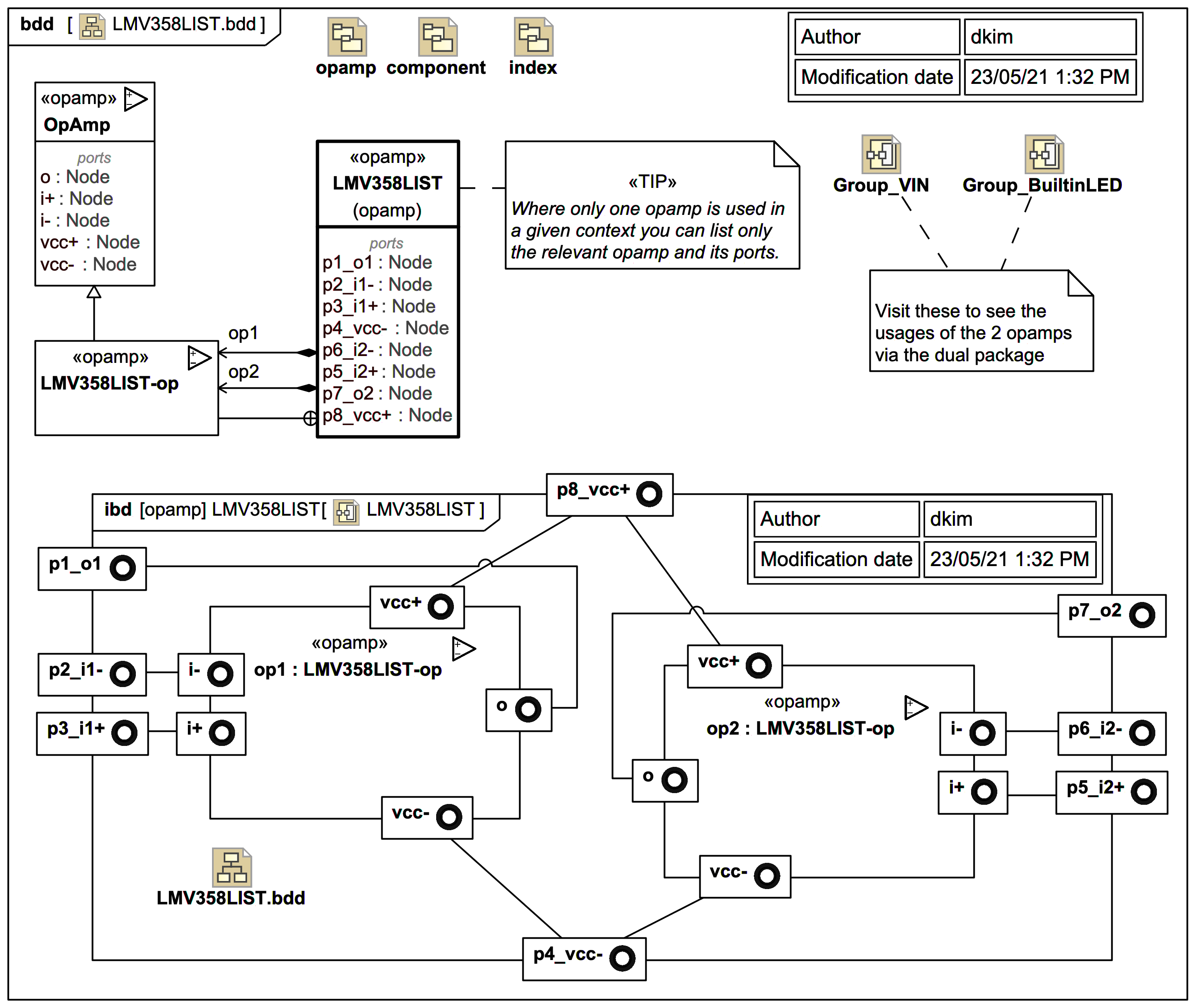 Note the use of an icon for the custom stereotype «opamp». In this case it is also applied to the dual opamp package (parent/group).