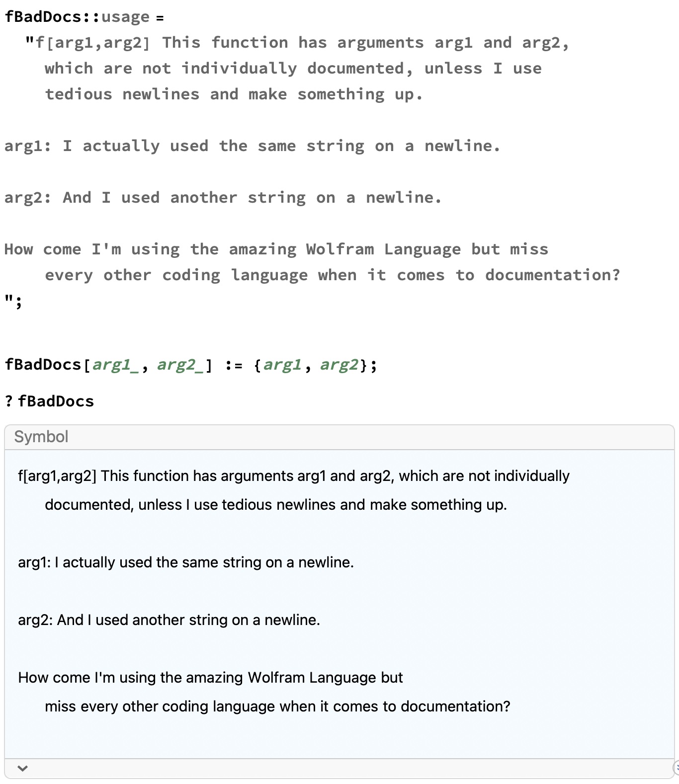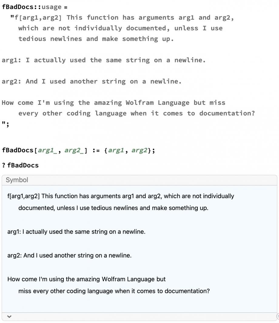 For any code-oriented developer who is used to documenting functions and their arguments coherently, easily, right there where the code is (and used to staying in their "coding zone"), the current Mathematica ::usage and Documentation Tools are approaches inadequate.
