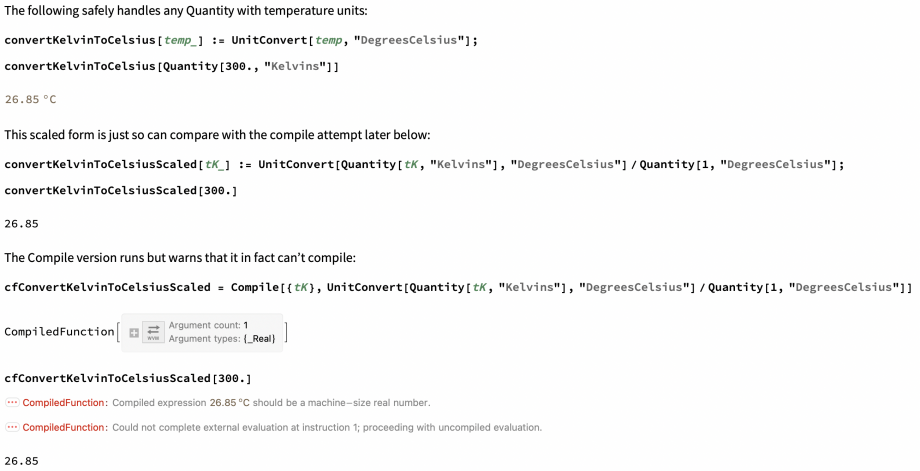 The example shows Compile failing with UnitConvert, but it also fails with anything that returns a Quantity, which is not very useful if you have a units-aware library. The only way to get around it is to pre-scale all Quantity arguments in a wrapper, delegate to a compiled function that does not use Quantity, and then scale the result on the way back out, which defeats the entire purpose.