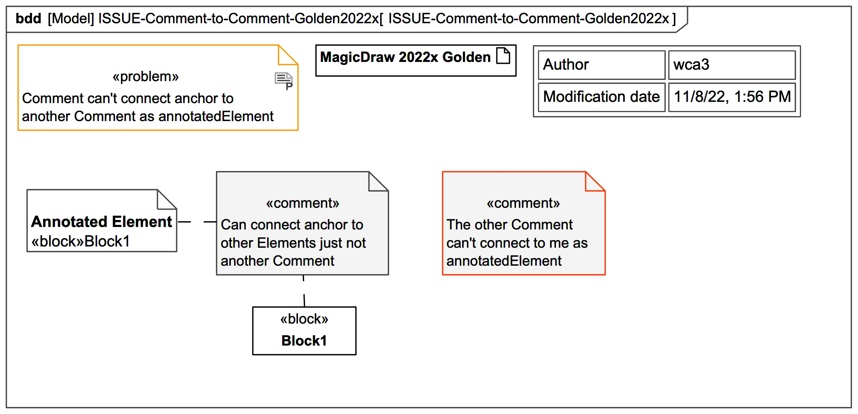 In MagicDraw 2022x Golden (and still in 2022x Refresh1) an anchor from a Comment will not connect to another Comment as annotatedElement