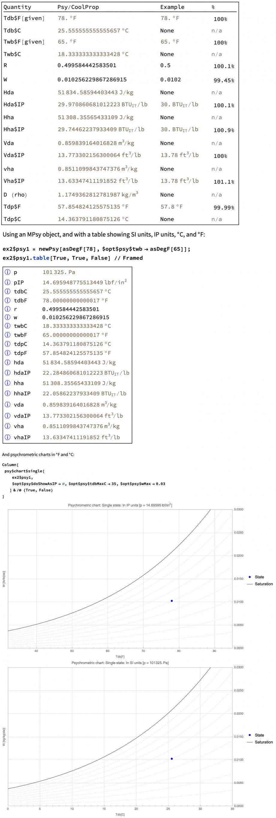 Below the custom table, the same values generated automatically by a Webel MPsy object (via the CoolProp wrapper for Mathematica) are shown, and then the state position on psychrometric charts in °F and °C.