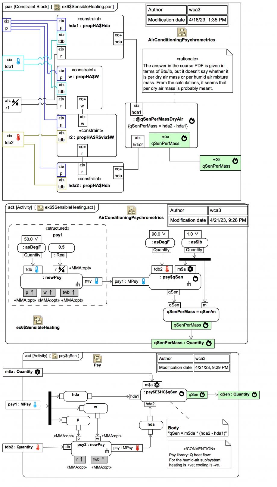 At the top we see a SysML Parametric Diagram representing a network of equations for the psychrometric properties obtained from low-level CoolProp wrappers for Mathematica, and a Psy