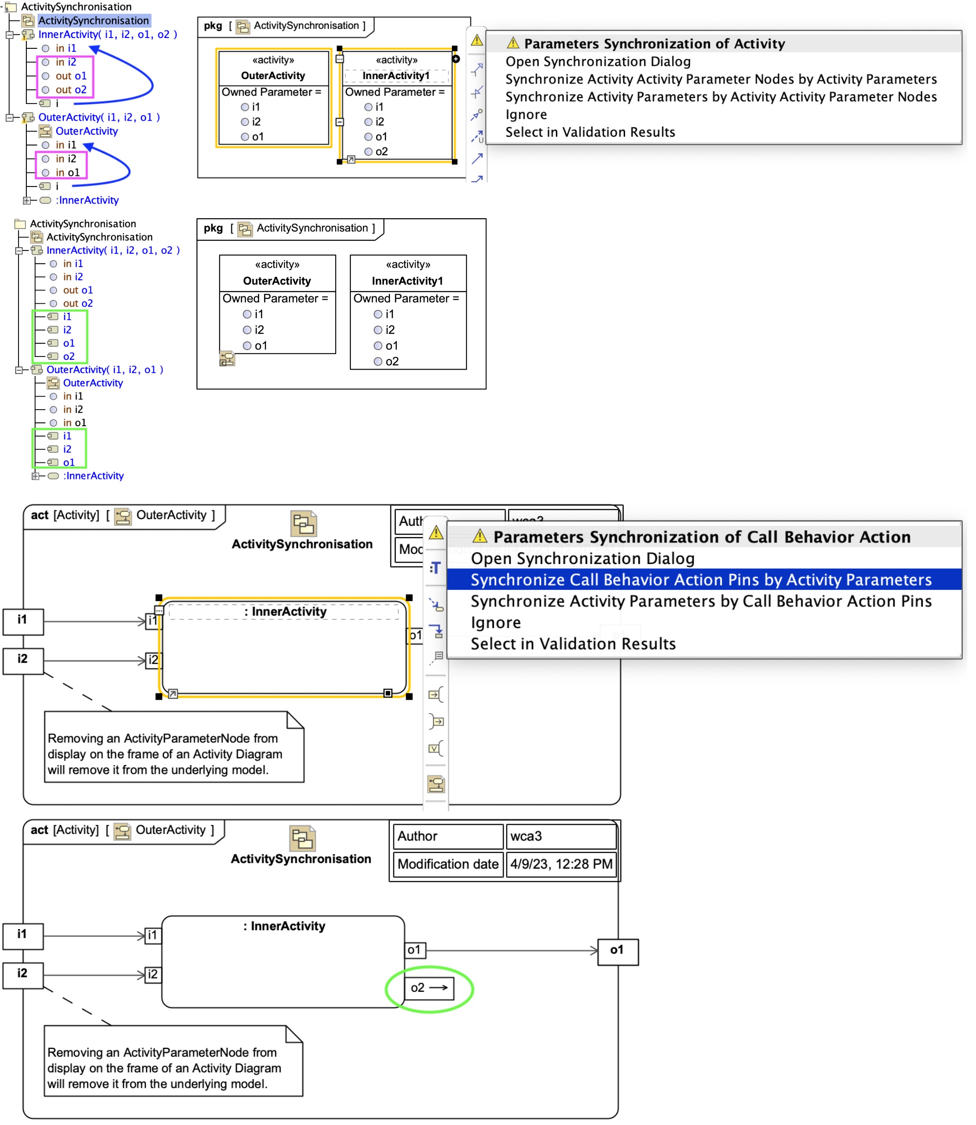 In a Package Diagram showing the Activities (with their owned parameters showing in element properties compartments), the MagicDraw/Cameo validation engine fires, and gives a warning about the incorrect synchronisation of the Parameters and ActivityParameterNodes on each Activity and offers an actions to fix them, which are accepted (it was decided to synchronise the ActivityParameterNodes against the Parameters).