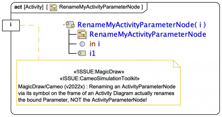 ISSUE/GOTCHA: MagicDraw/Cameo v2022x: UML/SysML: If you "rename" an ActivityParameterNode symbol on the frame of an Activity Diagram it actually renames the underlying Parameter (only) NOT the name of the ActivityParameterNode element!