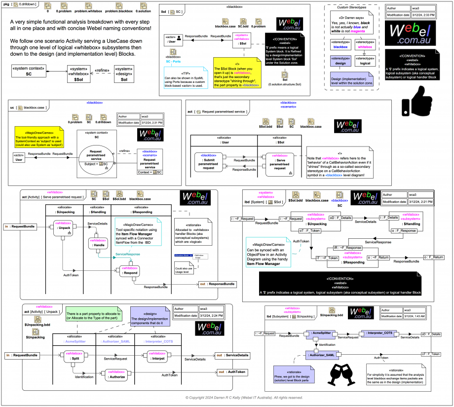 We follow one scenario Activity serving a UseCase down through one level of logical «whitebox» subsystems then down to the design (and implementation level) Blocks.