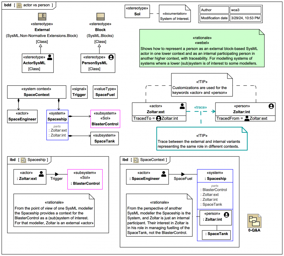 This shows how to represent a person as an "external" block-based SysML «actor» in one lower context (meaning relatively external to a lower sub-system of interest) and as an internal participating «person» in another higher System context, with traceability. This tip is handy for modelling systems of systems in teams where a lower (sub)system is of primary interest to some modellers, and the higher full System context is of primary interest to other modellers.